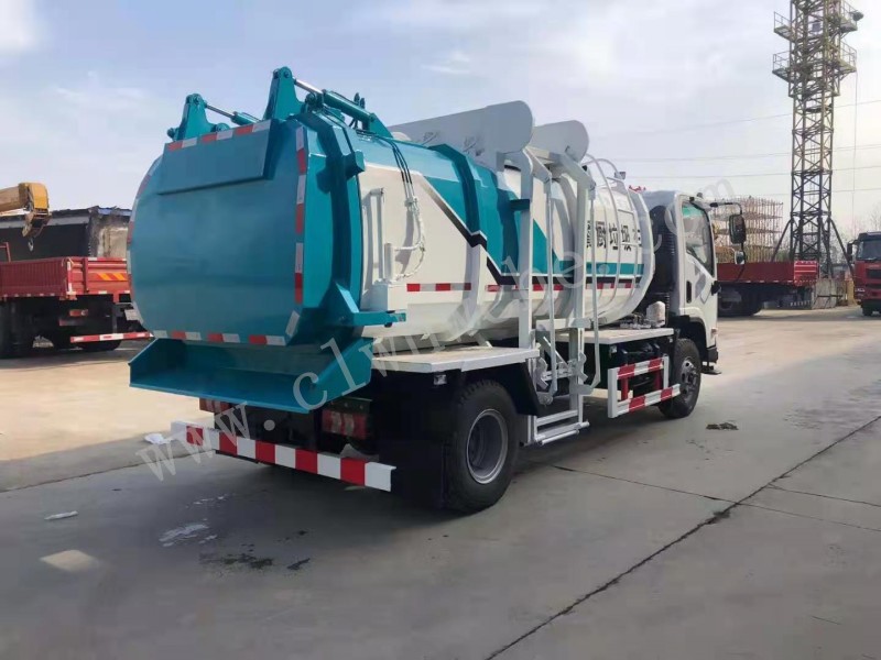 罐體采用4-5mm優質碳鋼制作,方形罐體,罐體前后封頭采用圓弧蝶形封頭,配拉桿式提升機,可掛120/240升垃圾桶,罐體底部配雙缸液壓舉升自卸,罐體尾門液壓打開和鎖緊+手動鎖緊裝置,罐內設固液分離裝置,罐尾設液體自流閥,液位窗,后門液壓開啟,帶工具箱,洗手裝置。