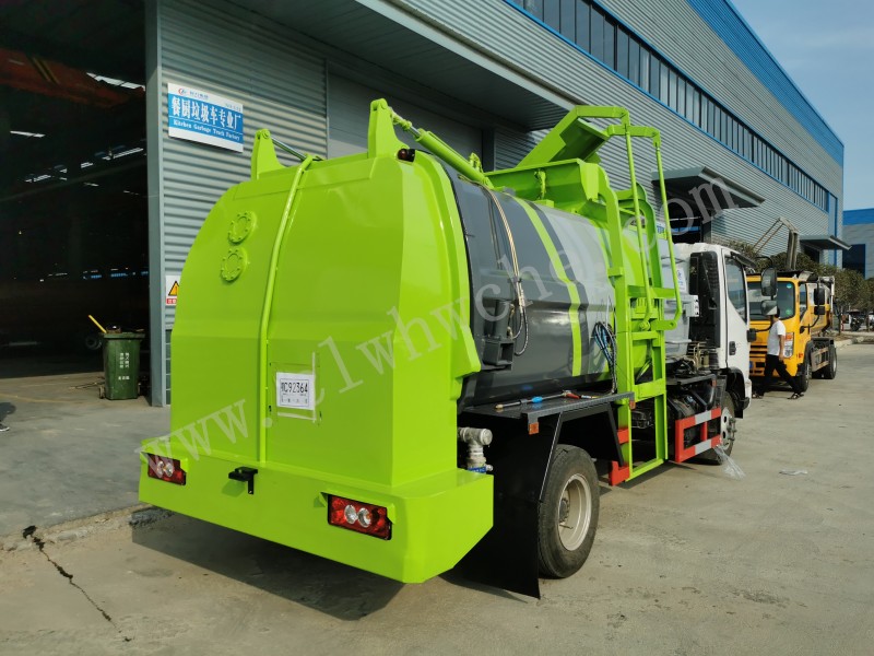 罐體采用4-5mm優(yōu)質(zhì)碳鋼制作,方形罐體,罐體前后封頭采用圓弧蝶形封頭,配拉桿式提升機(jī),可掛120/240升垃圾桶,罐體底部配雙缸液壓舉升自卸,罐體尾門液壓打開和鎖緊+手動(dòng)鎖緊裝置,罐內(nèi)設(shè)固液分離裝置,罐尾設(shè)液體自流閥,液位窗,后門液壓開啟,帶工具箱,洗手裝置。