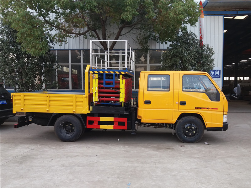 江鈴(新款)雙排高空作業車工程黃駕駛室,軸距3360mm,江鈴115馬力國五發動機JX493ZLQ4 (環保),油剎,五檔變速箱,7.00R16鋼絲胎,帶ABS.加裝空調。作業高度8米、10米、12米,帶兩個液壓支腿,吊藍額定載荷小于或等于500KG,工作壓力14MPA,帶油缸鎖定功能。